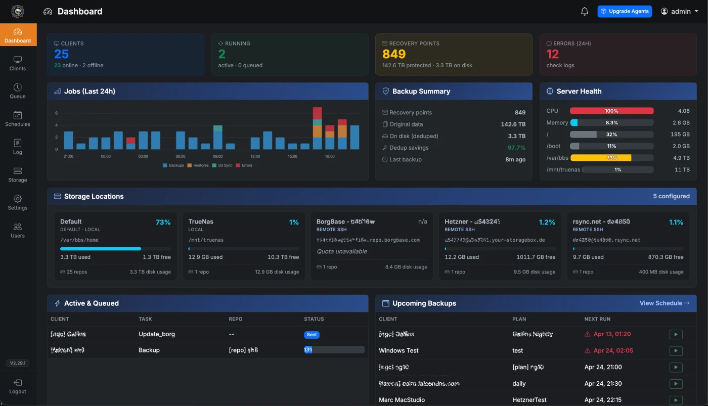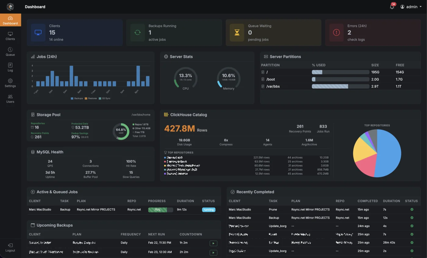 Borg Backup Server is a web GUI for BorgBackup, the deduplicating backup utility. Install a lightweight agent on each machine to schedule backups and restores, protect MySQL and PostgreSQL databases, monitor jobs in real time, sync repositories to S3 for offsite protection, and more.